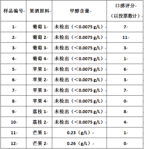 結(jié)果顯示,4種水果只有芒果有檢出微量甲醇,主要是因?yàn)槊⒐庵泻写罅康墓z,果膠經(jīng)過(guò)微生物發(fā)酵會(huì)產(chǎn)生甲醇。而其他水果果肉中果膠含量很低,所以甲醇含量極低。雖然水果果皮含有少量果膠,但去除后對(duì)結(jié)果影響較大。果酒口感主要受水果果肉香味、糖含量、天然色素等影響。