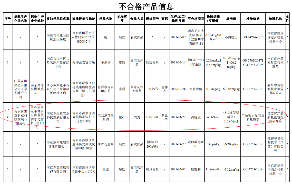 據(jù)悉,標稱南京保生堂農(nóng)業(yè)科技發(fā)展有限公司生產(chǎn)的桑葚蒸餾原漿酒(商標:紫色年華,生產(chǎn)日期:2021年1月22日),酒精度不符合產(chǎn)品明示標準及質(zhì)量要求規(guī)定。檢驗機構(gòu)為江蘇省產(chǎn)品質(zhì)量監(jiān)督檢驗研究院。