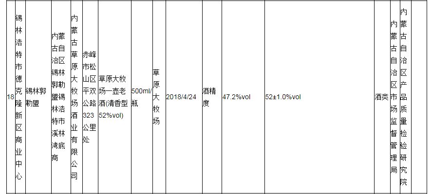 在質(zhì)量指標(biāo)與標(biāo)簽標(biāo)示值不符方面,錫林郭勒盟錫林浩特市德克隆新區(qū)商業(yè)中心銷(xiāo)售的、內(nèi)蒙古草原大牧場(chǎng)酒業(yè)有限公司生產(chǎn)的草原大牧場(chǎng)一壺老酒(清香型52%vol)(生產(chǎn)日期:2018/4/24,規(guī)格型號(hào):500ml/瓶),酒精度與產(chǎn)品標(biāo)簽標(biāo)示值不符。檢驗(yàn)結(jié)果:47.2%vol,標(biāo)準(zhǔn)值:52±1.0%vol。檢驗(yàn)機(jī)構(gòu)為內(nèi)蒙古自治區(qū)產(chǎn)品質(zhì)量檢驗(yàn)研究院。