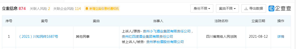 (2021)川知民終1687號(hào)顯示,該案原告為貴州小飛酒業(yè)集團(tuán)有限責(zé)任公司、貴州紅四渡酒業(yè)集團(tuán)有限責(zé)任公司,被告為貴州茅臺(tái)酒股份有限公司,案由為其他民事。審理法院為四川省高級(jí)人民法院,立案時(shí)間為2021年8月12日。