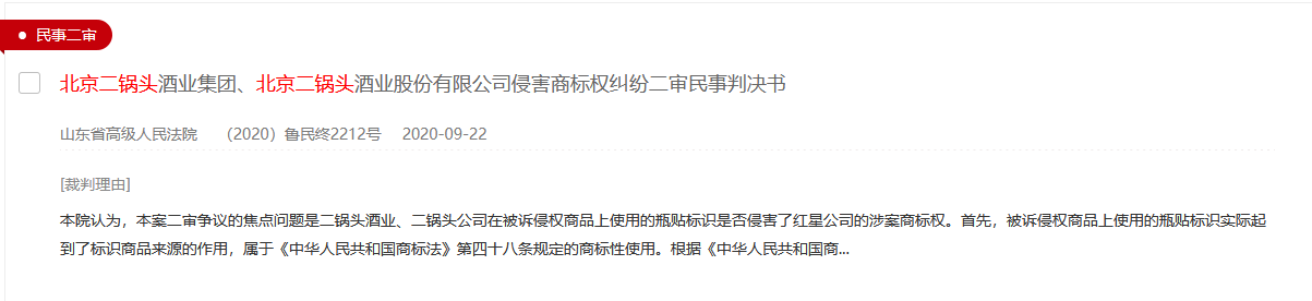 中國(guó)裁判文書網(wǎng)公開資料顯示,2020年,北京二鍋頭旗下相關(guān)產(chǎn)品上使用的瓶貼標(biāo)識(shí),與紅星二鍋頭酒產(chǎn)品注冊(cè)商標(biāo)相近,法院裁決前者賠償紅星二鍋頭10萬(wàn)元。