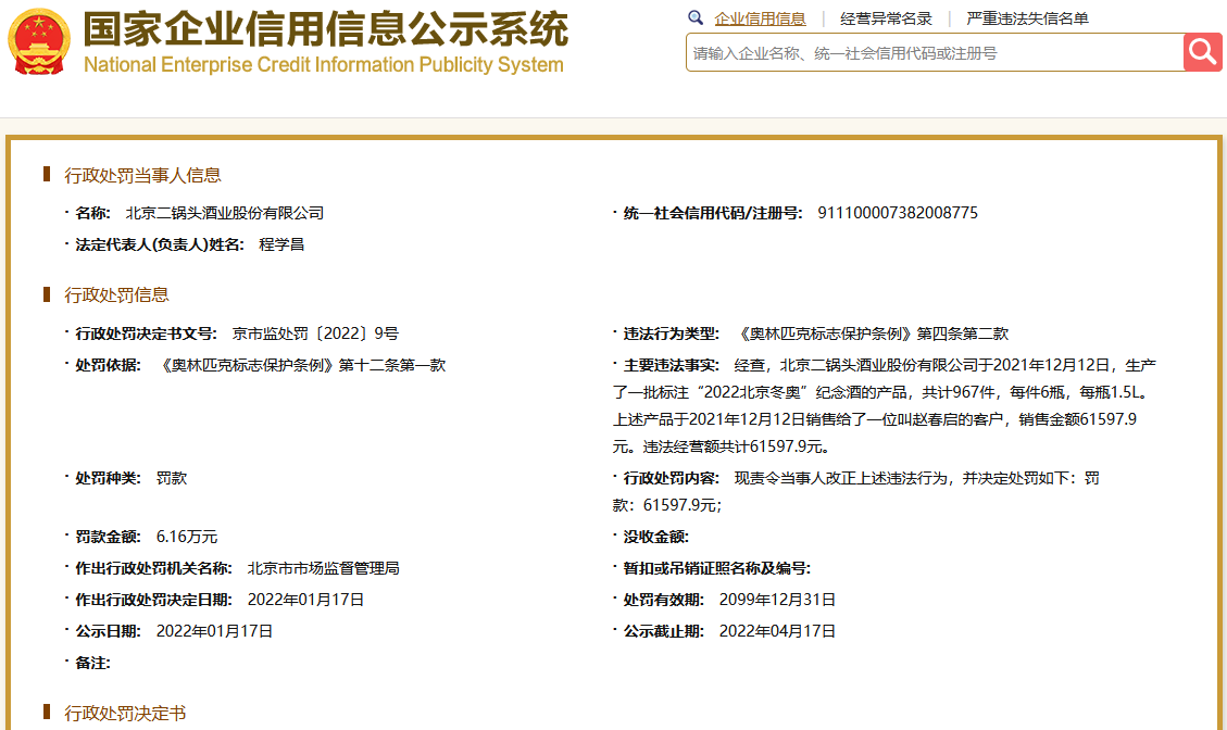 北京二鍋頭酒業(yè)股份有限公司因生產(chǎn)一批標(biāo)注“2022北京冬奧”紀(jì)念酒的產(chǎn)品,2022年1月17日,其被北京市市場(chǎng)監(jiān)管局罰款6.1萬(wàn)余元。