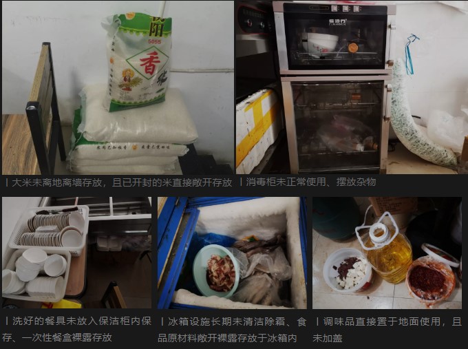毅欣快餐(吳興毅欣小吃店)入選理由為大米未離地離墻存放且已開封的米直接敞開存放,消毒柜未正常使用、擺放雜物,洗好的餐具未放入保潔柜內(nèi)保存、一次性餐盒裸露存放,冰箱設(shè)施長期未清潔除霜、食品原材料敞開裸露存放于冰箱內(nèi),調(diào)味品直接置于地面使用且未加蓋。