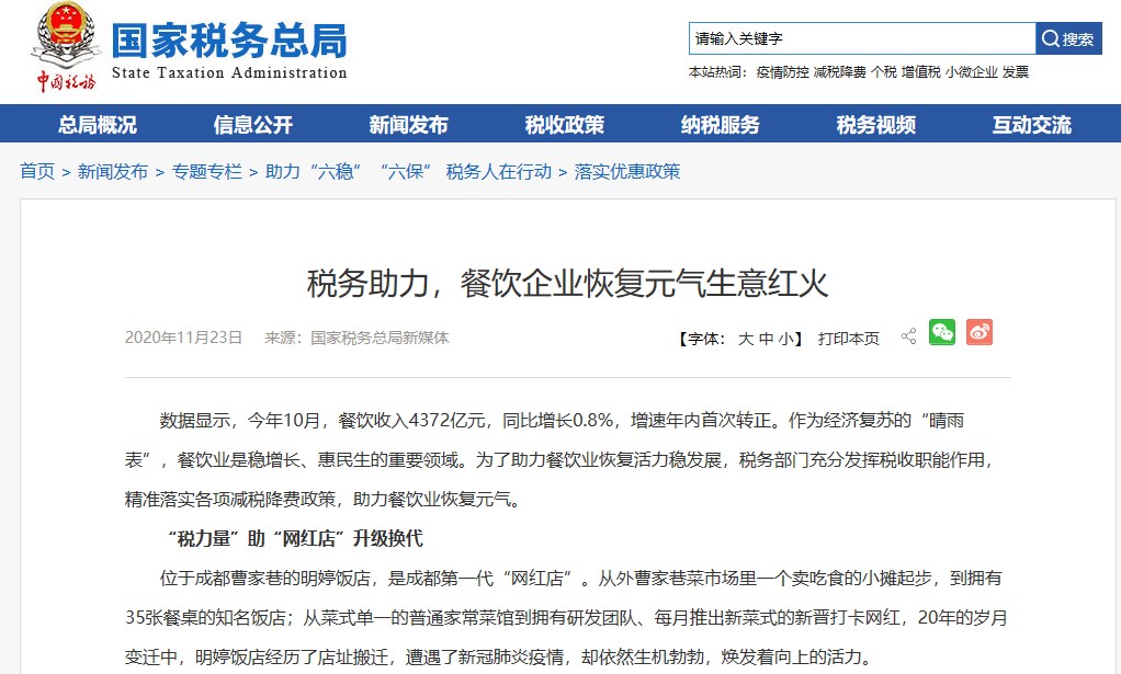 數(shù)據(jù)顯示,今年10月,餐飲收入4372億元,同比增長0.8%,增速年內首次轉正。作為經(jīng)濟復蘇的“晴雨表”,餐飲業(yè)是穩(wěn)增長、惠民生的重要領域。為了助力餐飲業(yè)恢復活力穩(wěn)發(fā)展,稅務部門充分發(fā)揮稅收職能作用,精準落實各項減稅降費政策,助力餐飲業(yè)恢復元氣。