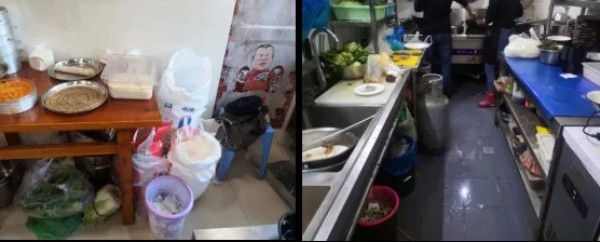 操作臺(tái)污穢不堪,垃圾清理不及時(shí),烹飪區(qū)雜物隨意擺放,證照、健康證未公示