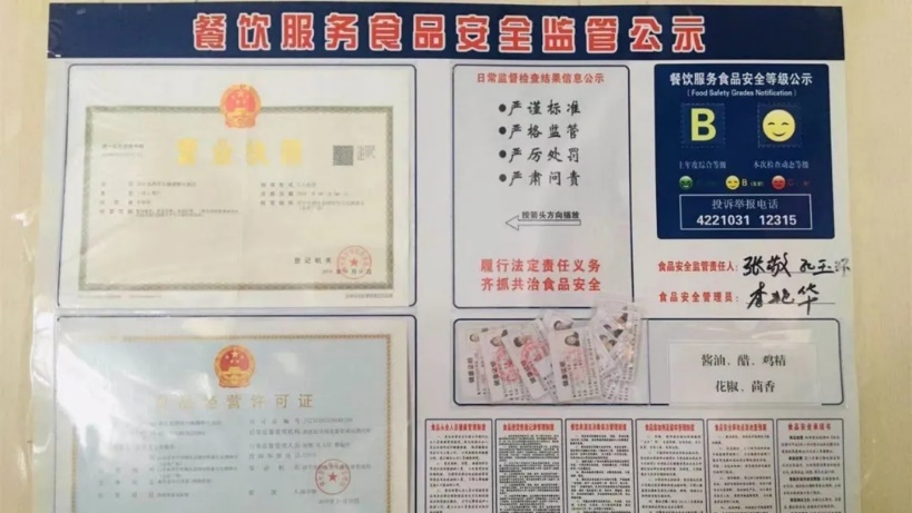 1.食品經(jīng)營許可證、健康證明、監(jiān)督檢查結(jié)果信息公示、食品安全自查報告、食品安全管理制度、承諾書等資質(zhì)齊全并上墻公示。