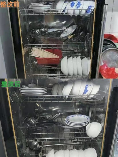 整改后:消毒柜規(guī)范使用,門口皮簾門已裝好,垃圾桶加蓋、后廚整潔。