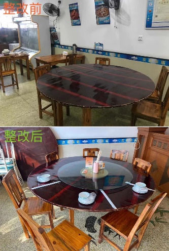 整改后:桌面上按要求粘帖桌貼,每桌配備公勺公筷,滅蠅燈正常使用,廚房衛(wèi)生整潔。