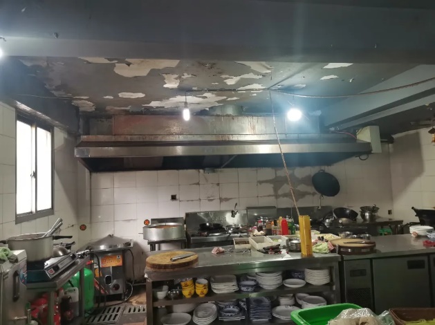 1、墻面到處布滿油煙污垢,墻面墻皮剝落。