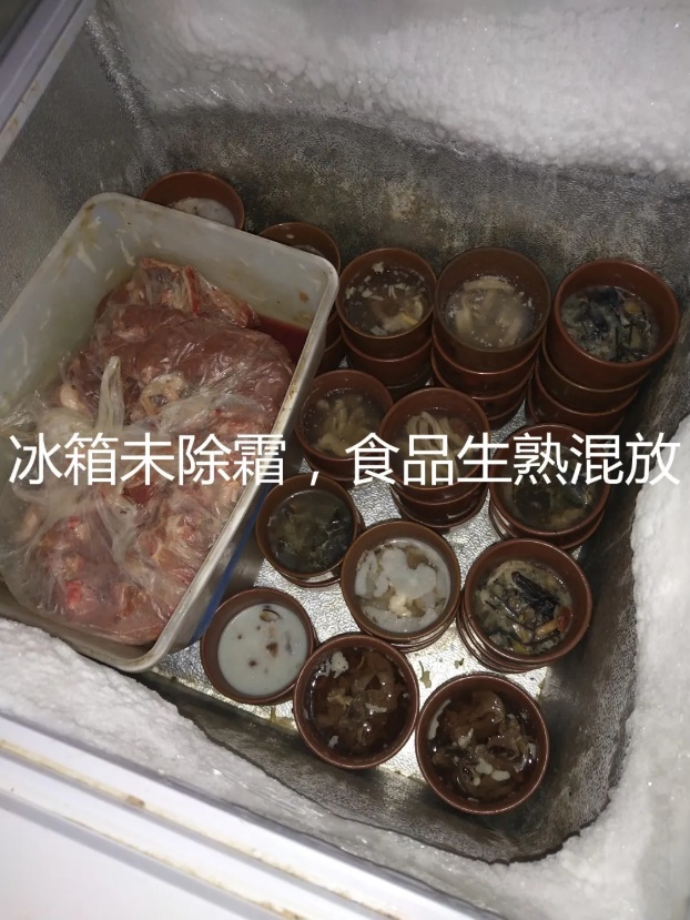 上榜理由:后廚油污重,垃圾桶未帶蓋,防蠅簾未正確懸掛,冰箱未除霜,生熟未分隔存放,食品未離地存放