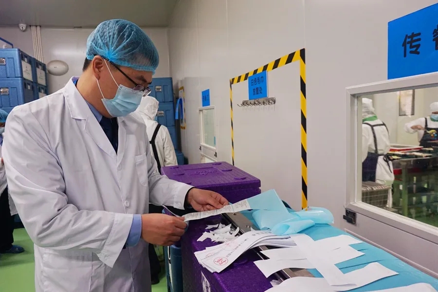 執(zhí)法人員檢查冷藏庫儲存半成品情況