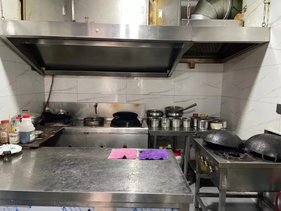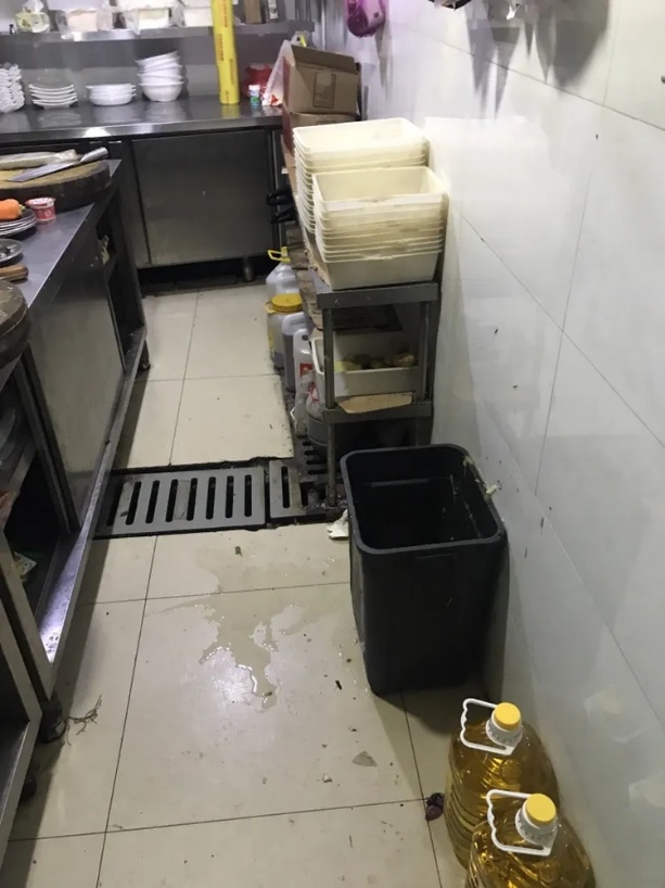 廚房內未使用腳踏加蓋垃圾桶,地面不干凈,食用油直接放在地上,沒有放在貨架上。廚房內天花板受潮發(fā)霉。