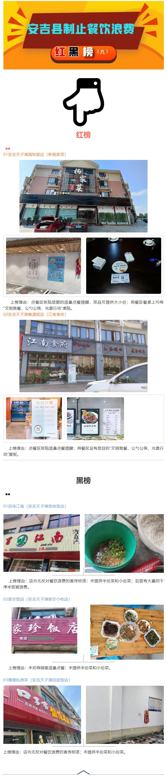 為防止食品浪費(fèi),節(jié)約資源,保護(hù)環(huán)境,進(jìn)一步貫徹落實(shí)《中華人民共和國(guó)反食品浪費(fèi)法》,浙江省安吉縣市場(chǎng)監(jiān)督管理局天子湖分局開展了制止餐飲浪費(fèi)專項(xiàng)整治行動(dòng),并根據(jù)檢查情況形成一期制止餐飲浪費(fèi)紅黑榜。