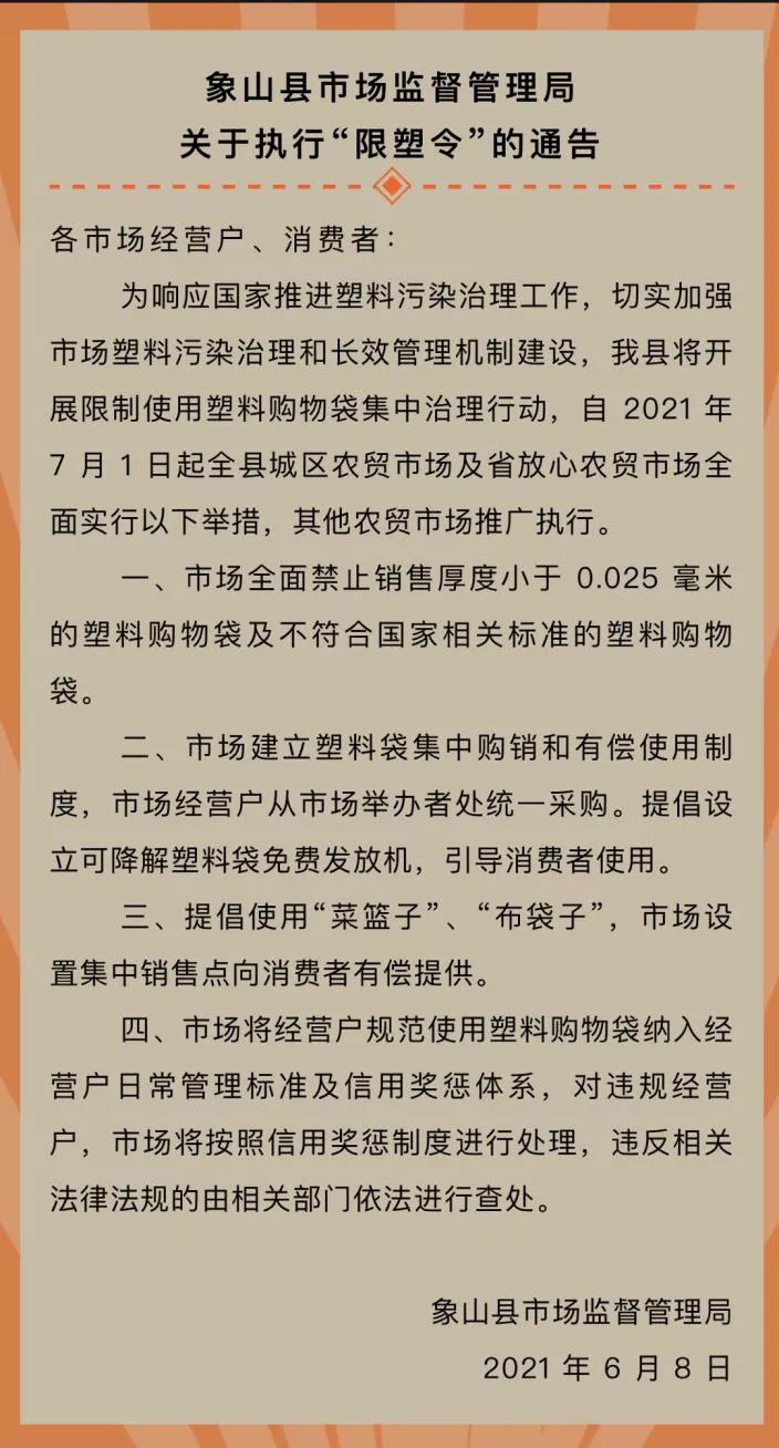 為整治“白色污染”,2021年6月8日,象山縣市場監(jiān)管局發(fā)布“限塑令”通告:自7月1日起,全縣農(nóng)貿(mào)市場將限制使用普通塑料購物袋。