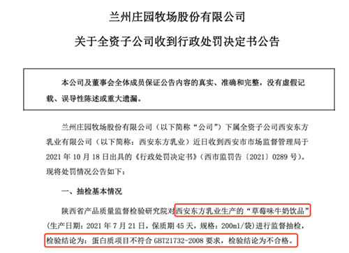 10月29日,莊園牧場在公告中披露,子公司西安東方乳業(yè)有限公司(簡稱“西安東方乳業(yè)”)近日收到西安市市場監(jiān)管局處罰決定書。西安東方乳業(yè)生產(chǎn)的1批次“草莓味牛奶飲品”(生產(chǎn)日期:2021年7月21日,保質(zhì)期45天,200mL/袋),經(jīng)監(jiān)督抽檢發(fā)現(xiàn)蛋白質(zhì)含量比例為0.93%,低于GB/T21732-2008(含乳飲料)規(guī)定的1%的最低限值,為不合格產(chǎn)品。