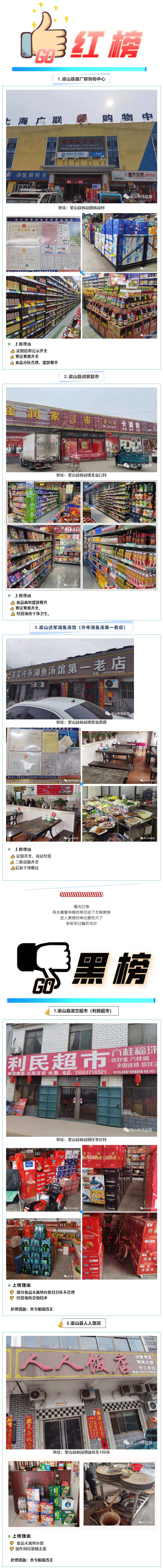 為進一步加強食品安全監(jiān)管,推進食品安全誠信體系建設,鞏固提升省級食品安全縣創(chuàng)建工作,2022年山東省梁山縣市場監(jiān)管局在全縣食品生產(chǎn)經(jīng)營各環(huán)節(jié)持續(xù)推行食品安全“紅黑榜”制度。日前,該局公布了第9期食品安全“紅黑榜”,梁山縣淑蘭超市(利民超市)、梁山縣人人飯店上了黑榜。