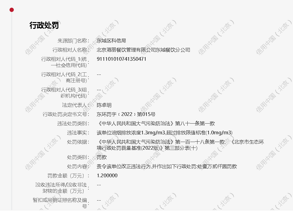 中國質(zhì)量新聞網(wǎng)訊(閆冬)信用中國(北京)網(wǎng)站披露,北京港麗餐飲管理有限公司東城餐飲分公司(以下簡稱:港麗東城餐飲分公司)近日因違反相關(guān)法規(guī)被北京市東城區(qū)生態(tài)環(huán)境局處罰。