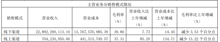 從數(shù)據(jù)上看,2021年海天味業(yè)在線上渠道取得的營(yíng)業(yè)收入大幅增長(zhǎng)了85.20%;然而盡管線上渠道取得了迅猛增長(zhǎng),但2021年海天味業(yè)線上、線下渠道營(yíng)業(yè)收入占主營(yíng)業(yè)務(wù)總營(yíng)收的比例分別為2.98%和97.02%,線上渠道顯然在短期內(nèi)難以對(duì)海天味業(yè)的整體業(yè)績(jī)形成有效支撐,不僅如此,由于線上業(yè)務(wù)拓展增加市場(chǎng)投入,海天味業(yè)2021年線上渠道毛利率同比大幅下滑13.22%。