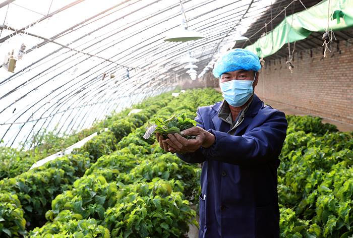 工作人員在溫室大棚展示正待收獲的蘇子葉。