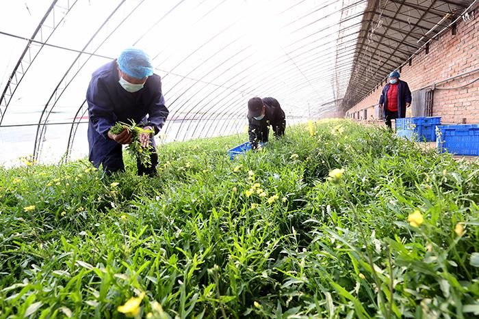 工作人員在溫室大棚里采收芝麻菜。