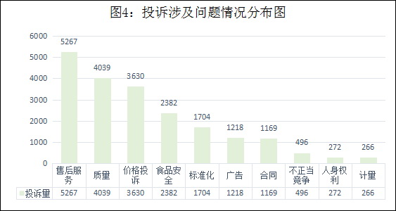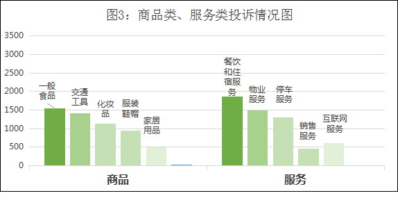 據(jù)介紹,今年第一季度接收社會公眾投訴中,商品類投訴15567件,服務(wù)類投訴14435件,分別占投訴總量的51.89%和48.11%。從商品消費類型來看,商品類投訴主要集中在一般食品、交通工具、化妝品、服裝鞋帽、家居用品。一般食品類投訴3307件,投訴量較多,占商品類投訴總量的21.24%。從服務(wù)消費類型來看,服務(wù)類投訴主要集中在餐飲和住宿服務(wù)、物業(yè)服務(wù)、停車服務(wù)、銷售服務(wù)、互聯(lián)網(wǎng)服務(wù)。餐飲和住宿服務(wù)類排在第一位,投訴2395件,占服務(wù)類投訴總量的16.59%。