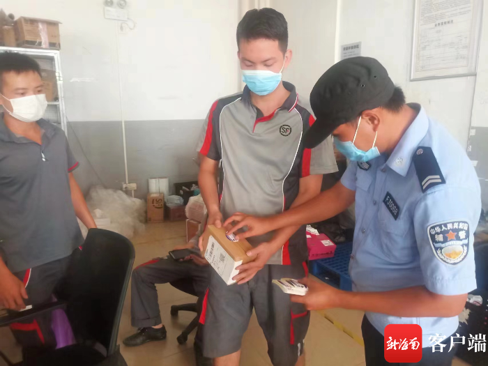 民警與快遞人員一起在快遞盒上貼反詐小紙貼。
