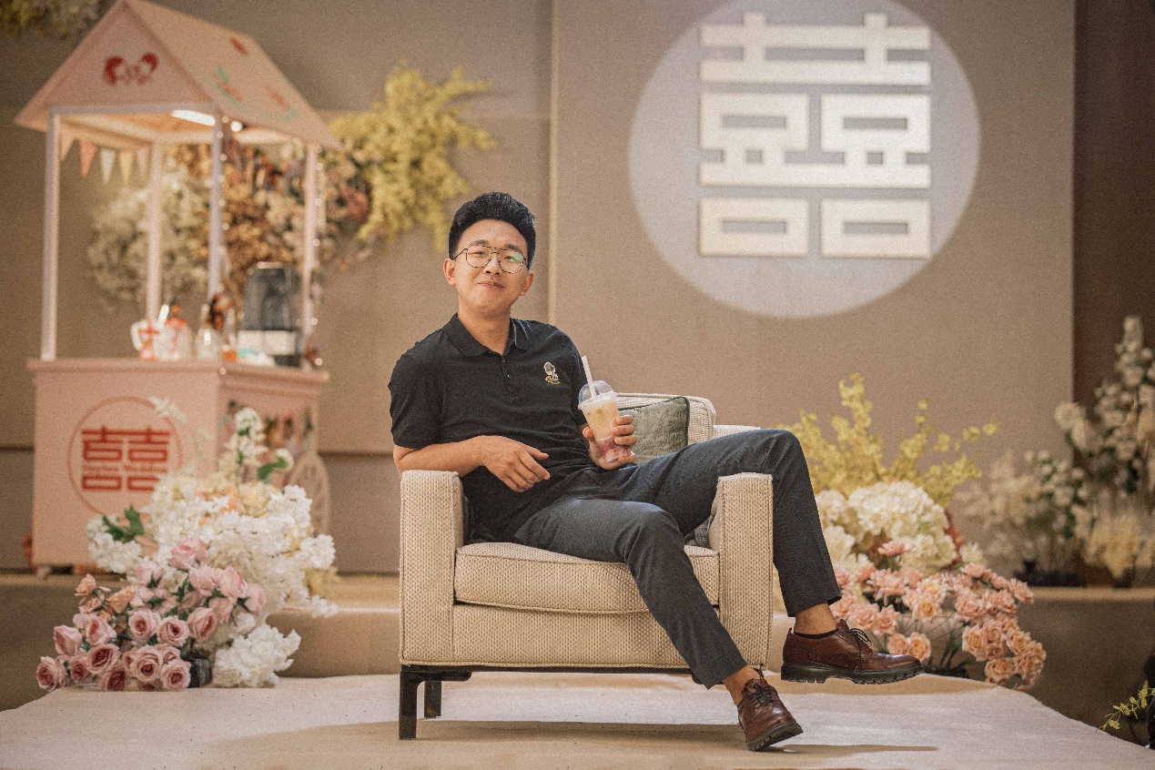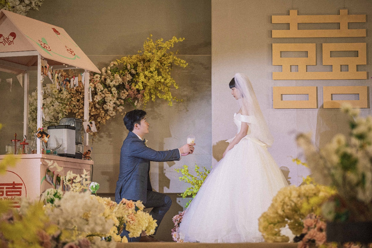 小策回憶到,結(jié)婚時因預(yù)算緊張,為了給妻子創(chuàng)造獨特的婚禮記憶,他親手做了一雙水晶鞋送給妻子,讓她十分感動并銘記在心。而喜茶粉絲用喜茶表白、策劃喜茶元素婚禮等故事也給了小策靈感,為此,他設(shè)計了讓新郎在婚禮上給新娘親手制作喜茶的情節(jié)。