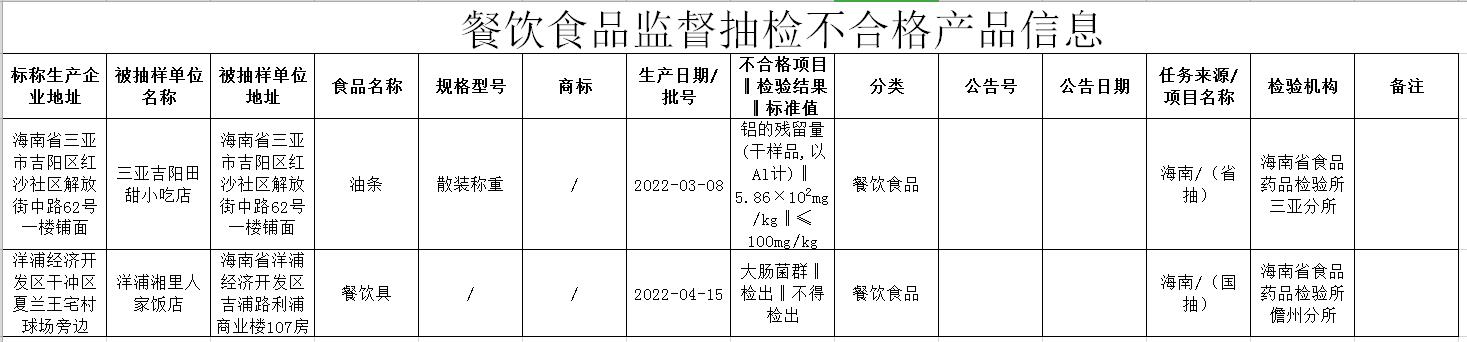 據(jù)介紹,抽檢不合格食品包括:三亞吉陽(yáng)田甜小吃店生產(chǎn)銷售的油條(生產(chǎn)日期:2022-03-08,規(guī)格型號(hào):散裝稱重),檢驗(yàn)項(xiàng)目鋁的殘留量(干樣品,以Al計(jì))不符合食品安全國(guó)家標(biāo)準(zhǔn)規(guī)定。