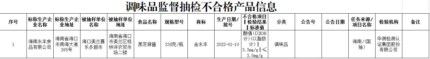 ??诿捞m喜樂多超市銷售的標(biāo)稱海南永豐食品有限公司生產(chǎn)的黑芝麻醬(生產(chǎn)日期:2022-01-10,規(guī)格型號:238克/瓶),檢驗項目酸值(以KOH計)(以脂肪計)不符合食品安全國家標(biāo)準(zhǔn)規(guī)定。《芝麻醬》(LS/T 3220-2017)中規(guī)定,芝麻醬中酸值限量值不得超過3mg/g。