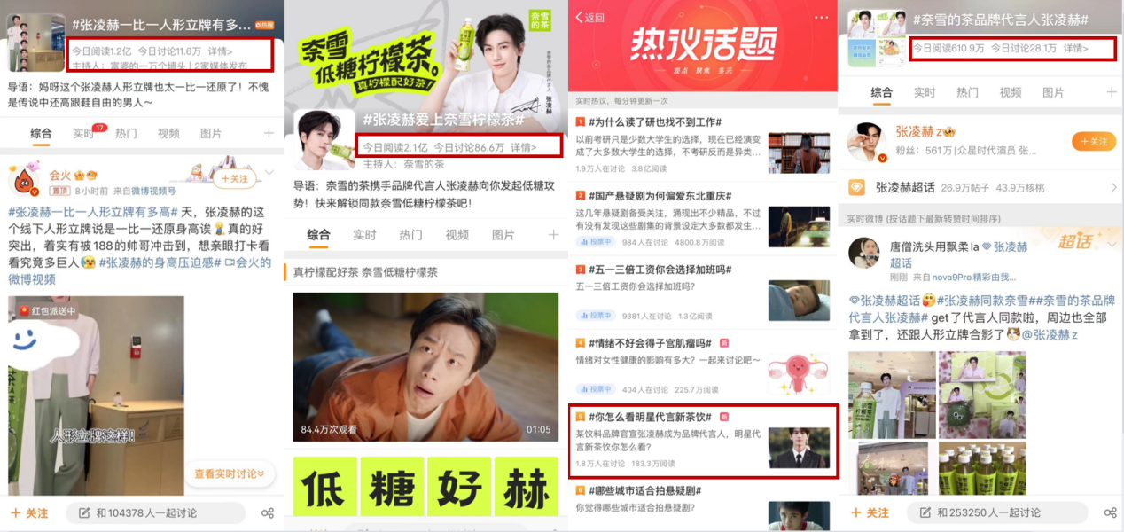 這對(duì)“店而優(yōu)則瓶”的新茶飲品牌來說,實(shí)屬佳績。與銷量同步上漲的還有奈雪低糖檸檬茶在社交平臺(tái)上的熱度。4月26日,微博話題#你怎么看明星代言新茶飲#登上熱議話題榜,相關(guān)話題#奈雪的茶品牌代言人張凌赫#、#張凌赫一比一人形立牌有多高#、#張凌赫愛上奈雪檸檬茶#等則共收獲超3億閱讀。