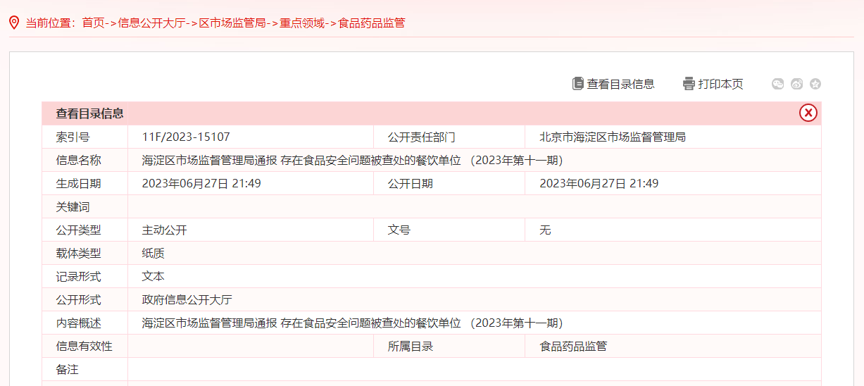 中國(guó)質(zhì)量新聞網(wǎng)訊 據(jù)北京市海淀區(qū)人民政府網(wǎng)站消息,2023年6月10日-6月24日,海淀區(qū)市場(chǎng)監(jiān)督管理局持續(xù)開(kāi)展餐飲食品安全大檢查工作,對(duì)海淀區(qū)29家餐飲門(mén)店進(jìn)行了依法查處,查處情況通報(bào)如下: