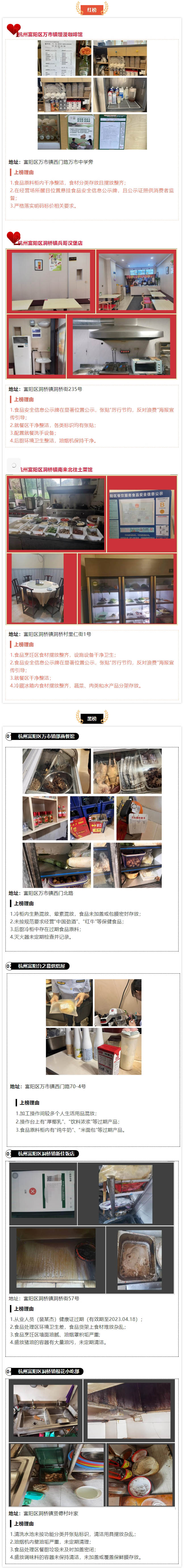 為進一步加強餐飲食品安全監(jiān)管,督促經(jīng)營主體責(zé)任落實,保障公眾飲食安全,杭州市富陽區(qū)市場監(jiān)管局圍繞“護航亞運”食品安全“大排查、大整治、大鞏固”專項行動,結(jié)合“制止餐飲浪費,迎接亞運盛會”文明餐桌活動,持續(xù)開展餐飲食品安全專項治理行動,重點檢查餐飲服務(wù)單位證照持有、食材采購、環(huán)境衛(wèi)生、個人衛(wèi)生、餐具消毒、過期食品、陽光廚房、外賣封簽、反食品浪費、文明餐桌等內(nèi)容?,F(xiàn)公布6月份餐飲食品安全和反食品浪費紅黑榜。