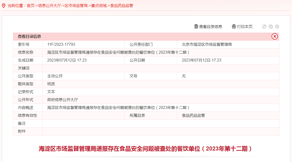 中國質(zhì)量新聞網(wǎng)訊 據(jù)北京市海淀區(qū)人民政府網(wǎng)站7月12日消息,2023年6月25日-7月9日,海淀區(qū)市場監(jiān)督管理局持續(xù)開展餐飲食品安全大檢查工作,對海淀區(qū)15家餐飲門店進(jìn)行了依法查處,查處情況通報(bào)(2023年第十二期)如下: