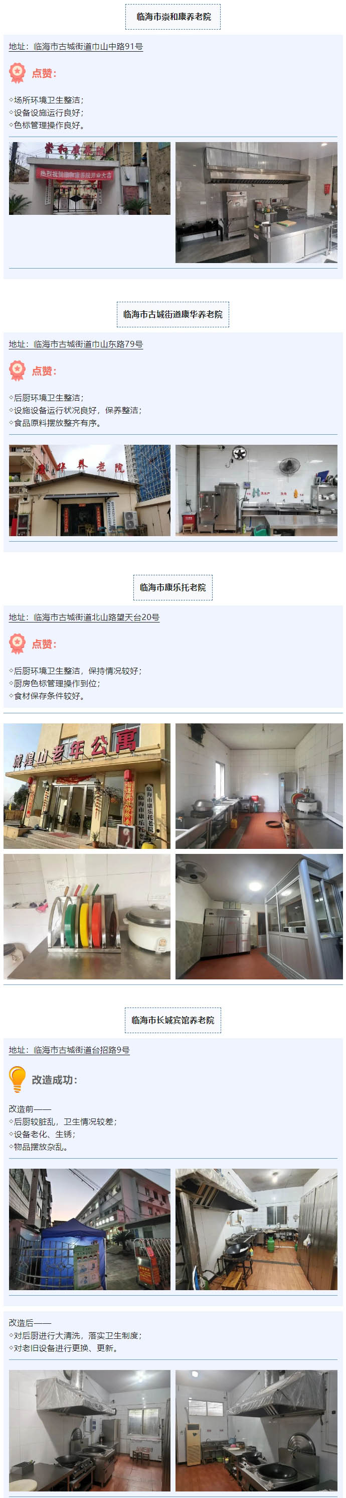 為進一步規(guī)范養(yǎng)老機構(gòu)食堂的餐飲安全服務(wù)水平,守護全市老年群體的飲食健康,浙江省臨海市市場監(jiān)督管理局開展轄區(qū)內(nèi)養(yǎng)老機構(gòu)晾曬曝光活動,強化重點行業(yè)、重點群體的食品安全透明化力度,倒逼餐飲主體規(guī)范經(jīng)營?,F(xiàn)公示4家古城街道的養(yǎng)老機構(gòu)食堂后廚。