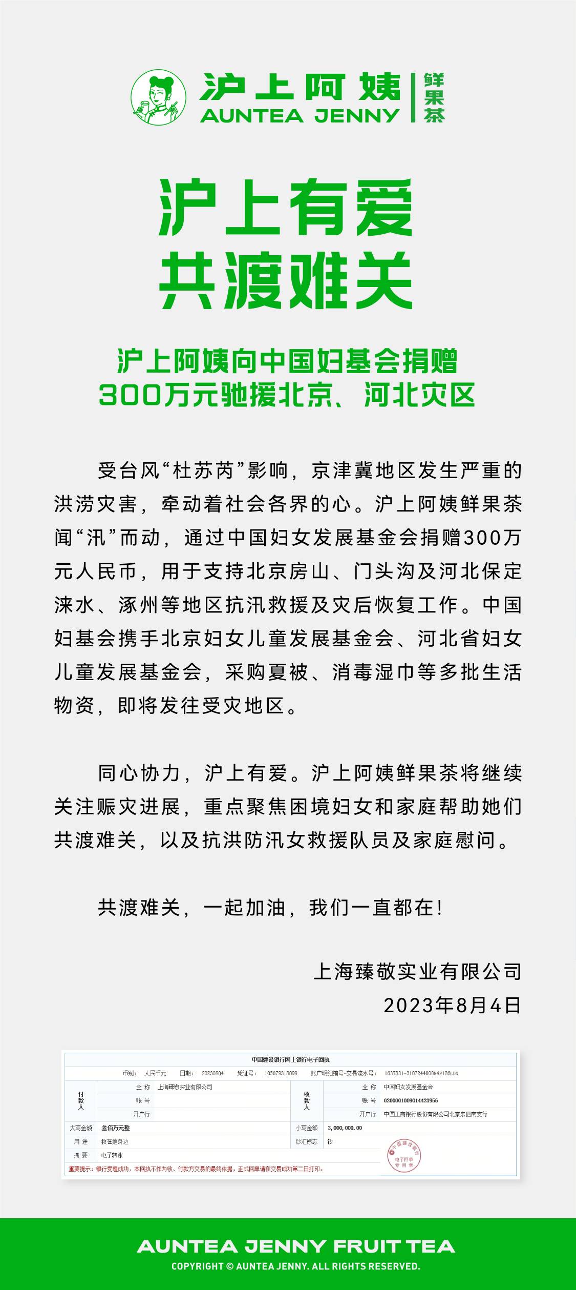 8月4日,滬上阿姨鮮果茶宣布通過(guò)中國(guó)婦女發(fā)展基金會(huì)捐贈(zèng)300萬(wàn)元人民幣,用于支持京冀地區(qū)抗汛救援及災(zāi)后恢復(fù)等工作。中國(guó)婦基會(huì)攜手北京婦女兒童發(fā)展基金會(huì)、河北省婦女兒童發(fā)展基金會(huì),采購(gòu)夏被、消毒濕巾等多批生活物資,即將發(fā)往受災(zāi)地區(qū)。