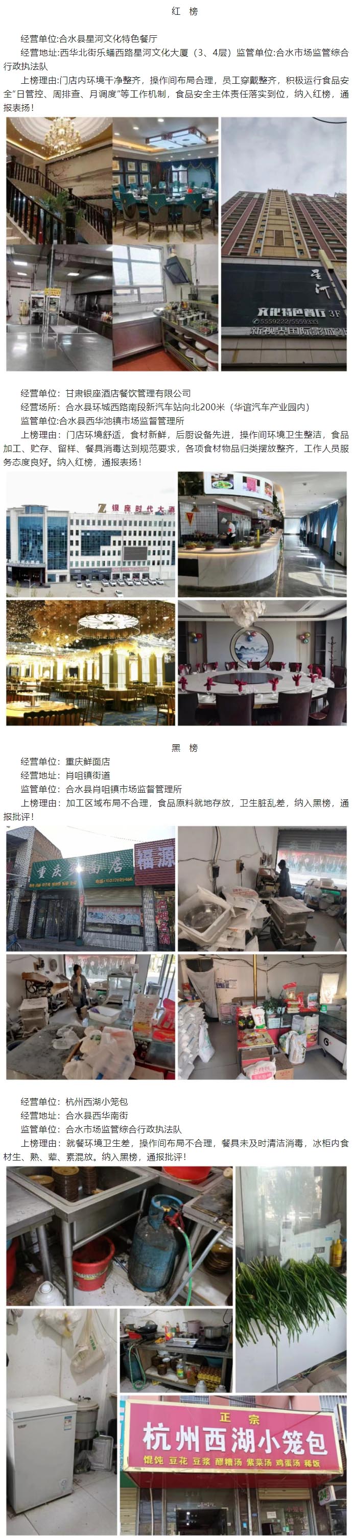 為切實提升合水縣餐飲服務(wù)行業(yè)食品安全水平,督促餐飲服務(wù)單位落實食品安全主體責(zé)任,保障公眾飲食安全,甘肅省合水縣市場監(jiān)督管理局按照《合水縣餐飲服務(wù)食品安全“紅黑榜”管理制度(試行)》的通知規(guī)定,開展全縣餐飲服務(wù)單位“紅黑榜”評定活動,通過榜單表揚“整潔優(yōu)”,曝光“臟亂差”,鼓勵先進(jìn),鞭策后進(jìn),進(jìn)一步提升合水縣餐飲單位食品安全水平,讓廣大消費者買得放心,吃得安心!本期發(fā)布紅榜餐飲單位2家。
