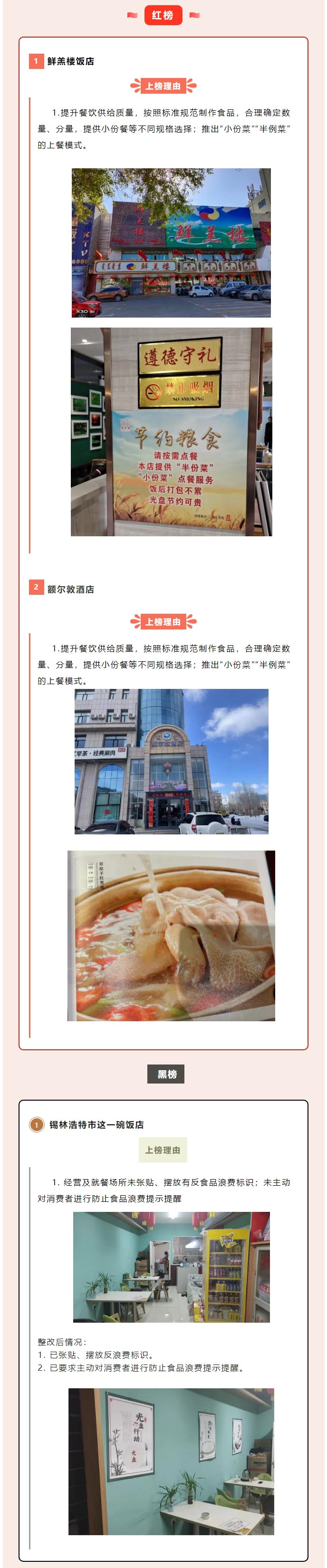 為宣傳先進典型,曝光浪費現(xiàn)象,引導(dǎo)公眾樹立正確餐飲消費觀念,構(gòu)建反食品浪費社會共治格局,2024年我局將繼續(xù)定期發(fā)布全市制止餐飲浪費“紅黑榜”,將制止餐飲浪費工作中表現(xiàn)優(yōu)秀的餐飲單位列入“紅榜”,將不重視制止餐飲浪費的餐飲單位列入“黑榜”。根據(jù)監(jiān)督檢查情況,現(xiàn)發(fā)布制止餐飲浪費“紅黑榜”第一期。