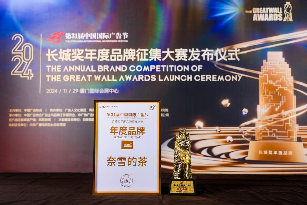 11月29日,第31屆中國國際廣告節(jié)·長城獎年度品牌發(fā)布儀式上,奈雪的茶榮獲“長城獎連鎖飲品行業(yè)年度品牌”大獎。同時,憑借“好果茶不加糖”倡議行動斬獲年度品牌創(chuàng)新發(fā)展案例。