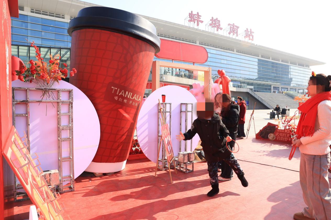 蚌埠南站廣場,一片以新年紅色為主色調(diào)布置的美陳區(qū)域映入眼簾,營造濃郁的新年氛圍。整體活動(dòng)區(qū)域分為打卡區(qū)、套圈區(qū)、轉(zhuǎn)盤區(qū)及領(lǐng)取區(qū)四大板塊,吸引眾多旅客駐足參與。無論拍照打卡還是參與游戲互動(dòng),每位參與者都能感受到濃濃的節(jié)日氣氛和甜啦啦的熱情款待。