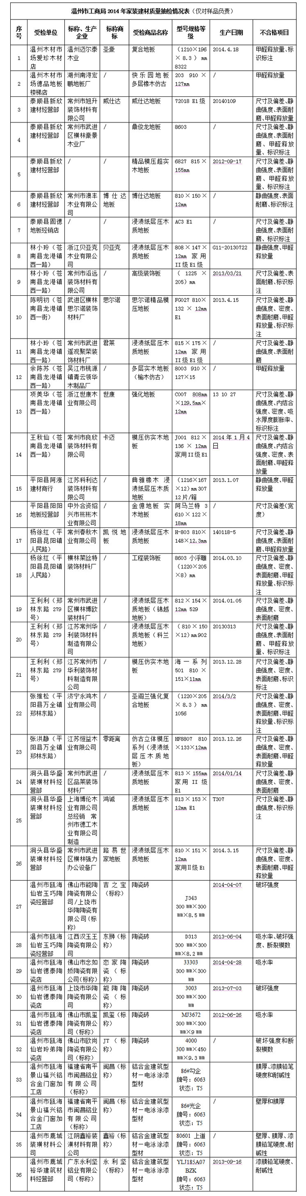 11日從溫州市工商局官網(wǎng)獲悉,該局于2014年第二季度開(kāi)展流通領(lǐng)域家裝建材專項(xiàng)抽查檢驗(yàn),共抽樣檢查33家單位經(jīng)銷的83批次家裝建材。經(jīng)檢驗(yàn),合格47批次,不合格36批次,合格率為56.63%。