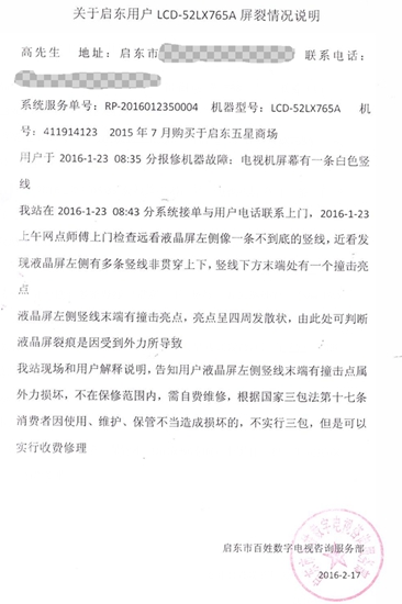 夏普商貿(mào)(中國(guó))有限公司向本網(wǎng)提供的一份高先生所在維修網(wǎng)店情況說明中描述稱:“網(wǎng)點(diǎn)師傅上門檢查,遠(yuǎn)看液晶屏左側(cè)像一條不到底的豎線,近看發(fā)現(xiàn)液晶屏左側(cè)有多條豎線非貫穿上下,豎線下方末端處有一個(gè)撞擊亮點(diǎn)。”“亮點(diǎn)呈四周發(fā)散狀,由此處可判斷液晶屏裂痕是因受到外力所導(dǎo)致?!?/p>