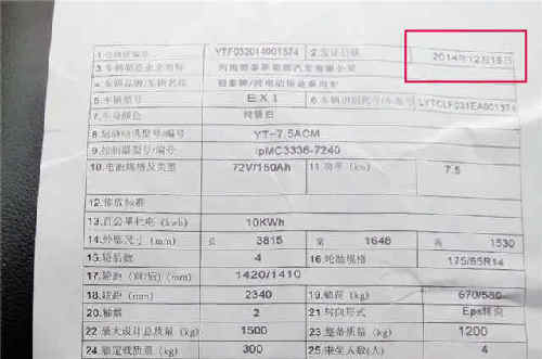 “沒(méi)電后車(chē)子也打不著火了,沒(méi)有辦法,我趕緊聯(lián)系了經(jīng)銷(xiāo)商,事后經(jīng)銷(xiāo)商派車(chē)將這輛趴窩的電動(dòng)車(chē)拖回了4S店?!蓖跸壬f(shuō),之后4S店對(duì)電瓶進(jìn)行了檢測(cè)發(fā)現(xiàn)該車(chē)之所以無(wú)法跑到承諾的的公路里程是因?yàn)殡娖康脑颉4送?,這時(shí)候他還意外發(fā)現(xiàn),車(chē)上的電瓶竟然是2014年生產(chǎn)的,不僅如此,事后他又查看了一下這輛車(chē)合格證的發(fā)證日期是2014年12月19日。