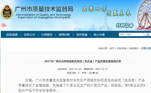 中國質(zhì)量新聞網(wǎng)訊 從廣州市質(zhì)量技術(shù)監(jiān)督局獲悉,該局近期對廣州市生產(chǎn)領域衣料用液體洗滌劑(洗衣液)產(chǎn)品質(zhì)量進行了監(jiān)督抽查,共抽查了37家企業(yè)生產(chǎn)的37批次產(chǎn)品,經(jīng)檢驗,有8家企業(yè)的8批次產(chǎn)品不符合標準要求。