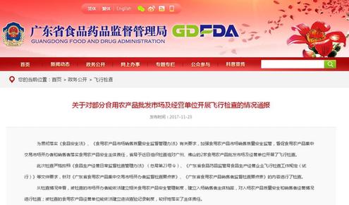 中國(guó)質(zhì)量新聞網(wǎng)訊 為貫徹落實(shí)《食品安全法》、《食用農(nóng)產(chǎn)品市場(chǎng)銷售質(zhì)量安全監(jiān)督管理辦法》有關(guān)要求,加強(qiáng)食用農(nóng)產(chǎn)品市場(chǎng)銷售質(zhì)量安全監(jiān)管,督促食用農(nóng)產(chǎn)品集中交易市場(chǎng)開辦者和銷售者落實(shí)食用農(nóng)產(chǎn)品安全主體責(zé)任,廣東省食藥監(jiān)局于近日組織檢查組對(duì)廣州、佛山的2家食用農(nóng)產(chǎn)品批發(fā)市場(chǎng)及經(jīng)營(yíng)單位開展了飛行檢查。