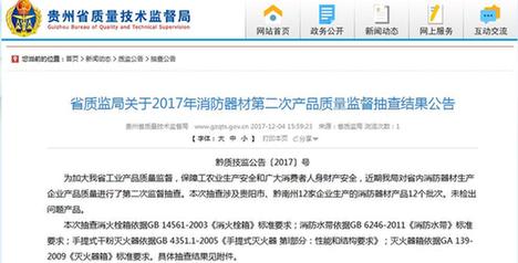 中國(guó)質(zhì)量新聞網(wǎng)訊 貴州省質(zhì)監(jiān)局12月4日發(fā)布“關(guān)于2017年消防器材第二次產(chǎn)品質(zhì)量監(jiān)督抽查結(jié)果公告”,公告稱,為加大貴州省工業(yè)產(chǎn)品質(zhì)量監(jiān)督,保障工農(nóng)業(yè)生產(chǎn)安全和廣大消費(fèi)者人身財(cái)產(chǎn)安全,近期貴州省質(zhì)監(jiān)局對(duì)省內(nèi)消防器材生產(chǎn)企業(yè)產(chǎn)品質(zhì)量進(jìn)行了第二次監(jiān)督抽查。本次抽查涉及貴陽(yáng)市、黔南州12家企業(yè)生產(chǎn)的消防器材產(chǎn)品12個(gè)批次。未檢出問(wèn)題產(chǎn)品。