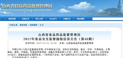 中國(guó)質(zhì)量新聞網(wǎng)訊? 12月11日,山西省食藥監(jiān)局官網(wǎng)發(fā)布2017年第46期食品安全監(jiān)督抽檢信息公告稱,本期公布170批次監(jiān)督抽檢結(jié)果,涉及糧食加工品、淀粉及淀粉制品、糕點(diǎn)、飲料、方便食品、水果制品、酒類、肉制品、乳制品和食用油、油脂及其制品等10大類。其中:不合格樣品9批次,合格樣品161批次。根據(jù)食品安全國(guó)家標(biāo)準(zhǔn),個(gè)別項(xiàng)目不合格,其產(chǎn)品即判定為不合格產(chǎn)品。