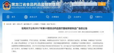 中國質(zhì)量新聞網(wǎng)訊 12月13日,黑龍江省食藥監(jiān)局官網(wǎng)公布2017年第10期違法藥品醫(yī)療器械保健食品廣告的公告稱,為加強(qiáng)廣告監(jiān)督管理,嚴(yán)厲打擊藥品、醫(yī)療器械、保健食品違法發(fā)布廣告的行為,規(guī)范黑龍江省藥品、醫(yī)療器械、保健食品廣告發(fā)布秩序,依據(jù)《藥品管理法》《廣告法》和《藥品管理法實(shí)施條例》《醫(yī)療器械監(jiān)督管理?xiàng)l例》《保健食品廣告審查暫行規(guī)定》,經(jīng)國家食品藥品監(jiān)督管理總局稽查局監(jiān)測發(fā)現(xiàn),2017年10月在黑龍江省行政區(qū)域內(nèi)發(fā)布的違法廣告(含外省企業(yè)產(chǎn)品在我省媒體發(fā)布者)5條次,其中涉及違法藥品廣告3條次、醫(yī)療器械廣告1條次、保健食品廣告1條次。該局已依法將違法情節(jié)嚴(yán)重的藥品、醫(yī)療器械、保健食品廣告移送工商行政管理部門查處。