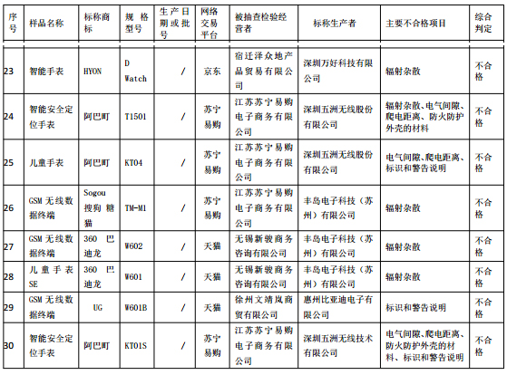 中國質(zhì)量新聞網(wǎng)訊 據(jù)江蘇省工商局官網(wǎng)2018年1月2日消息,2017年,該局組織對省內(nèi)網(wǎng)絡經(jīng)營者通過互聯(lián)網(wǎng)銷售的30批次智能兒童手表商品質(zhì)量進行抽檢,涉及天貓、淘寶網(wǎng)、京東商城、蘇寧易購、1號店等5家網(wǎng)絡交易平臺。經(jīng)檢驗,22個批次合格,8個批次不合格,總體合格率為73.33%。
