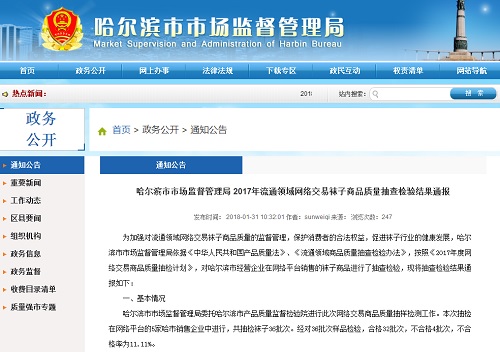 中國質(zhì)量新聞網(wǎng)訊 2018年1月31日,哈爾濱市市場監(jiān)督管理局官網(wǎng)通報(bào)2017年流通領(lǐng)域網(wǎng)絡(luò)交易襪子商品質(zhì)量抽查檢驗(yàn)結(jié)果,標(biāo)稱哈爾濱亞麻集團(tuán)有限公司生產(chǎn)的4批次“哈麻雙鶴”襪子樣品被檢出不合格。