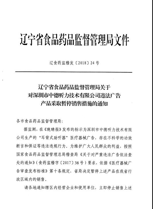 2018年3月27日,撫順市食品藥品監(jiān)督管理局官網(wǎng)發(fā)布通知,對(duì)深圳市中德聽力技術(shù)有限公司等兩家單位違法廣告產(chǎn)品采取暫停銷售措施。